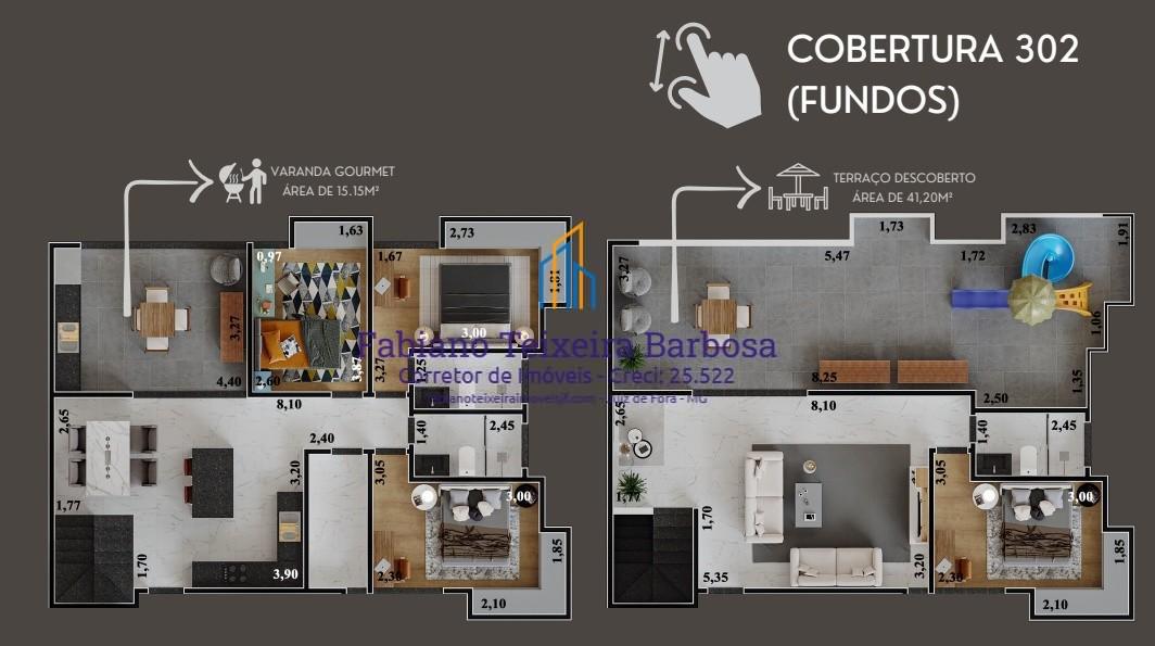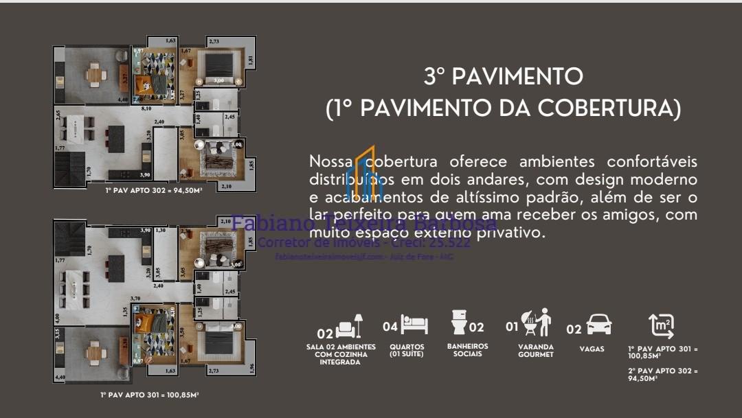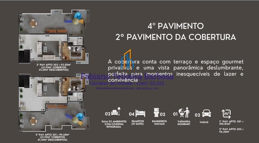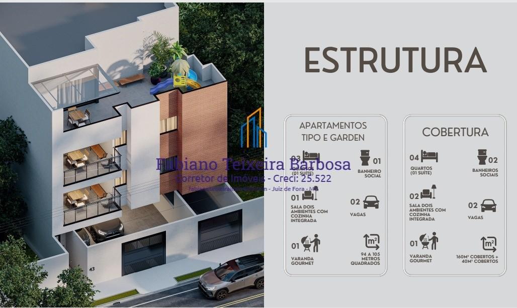 Cobertura nova dúplex disponível para venda no Bairro Aeroporto, bem pertinho da UFJF, da Embrapa e do Independência Shopping. Localização ótima com acesso bem rápido e facilitado ao Centro da cidade. O prédio conta com elevador e gás encanado. Em final de obra , entrega das chaves prevista para dezembro de 2026. Localização fantástica, em avenida plana com linha de ônibus urbano na porta, perto de tudo, a menos de 5 minutos do Independência Shoping e da UFJF, sem risco de enchentes ou desmoranamentos. A cobertura possui dois pavimentos, aproximadamente 210 m2 de área útil, ela é subdividida da seguinte forma.